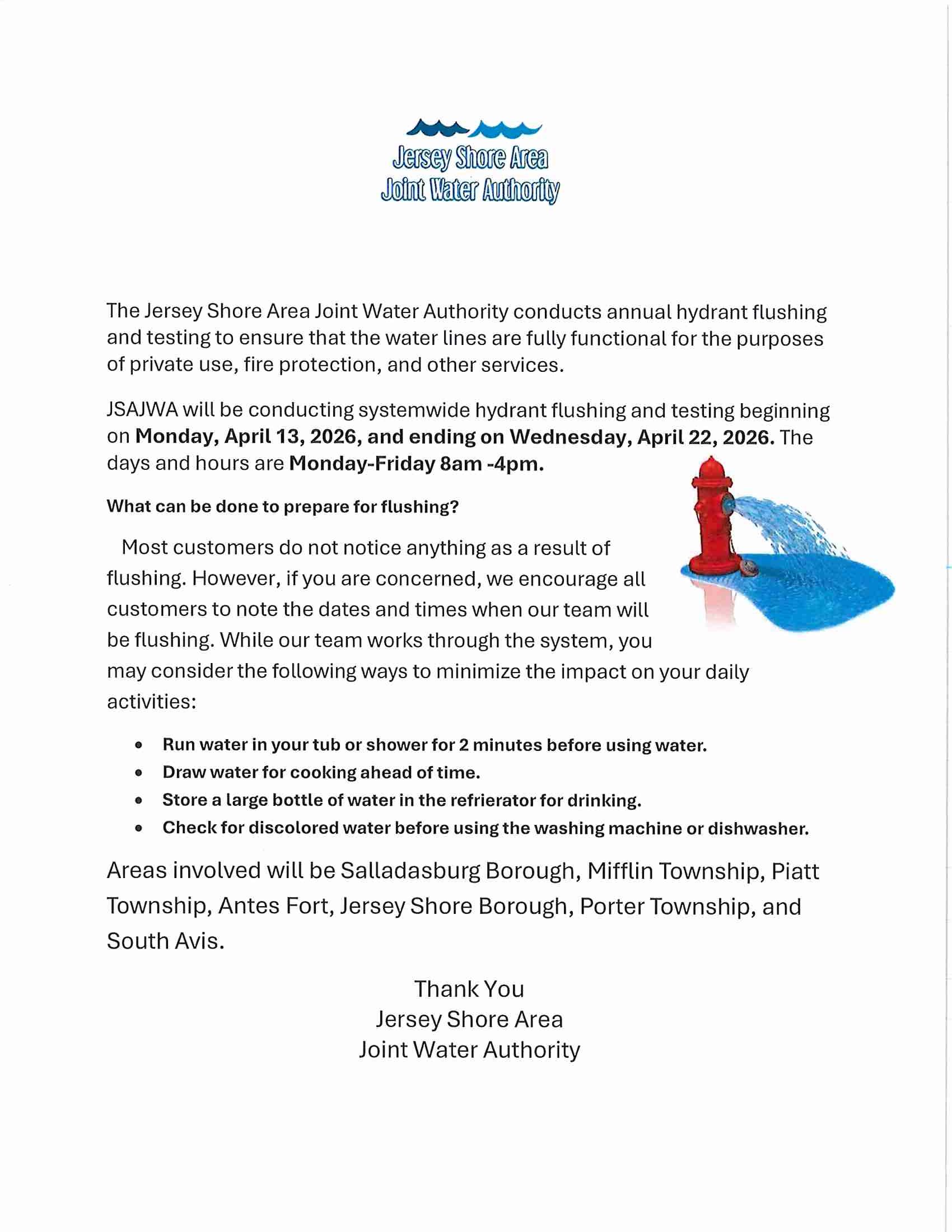 Jersey Shore is located along the West Branch of the Susquehanna River in southern Lycoming County, and provides easy access to recreation opportunities along the Susquehanna River, Pine Creek, and Larry’s Creek. These opportunities include trout fishing, hiking, mountain biking, camping, snowmobiling, hunting, outlet shopping at Woolrich, downhill and cross country skiing. Jersey Shore’s scenic river location, historic homes and small-town atmosphere make us a unique and pleasant place to call home.